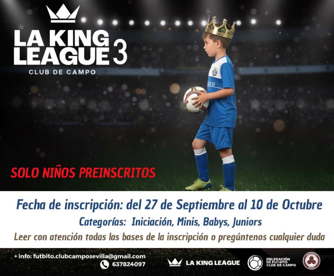 CLUB CAMPO SEVILLA - B 26/09/2025 - 10:42 AMNos complace anunciar que el Club de Campo Sevilla ha abierto el plazo de inscripción para la Liga de Futbito Infantil “La King League”. Esta es una oportunidad única para que los más pequeños disfruten del deporte, hagan nuevos amigos y desarrollen sus habilidades futbolísticas en un entorno seguro y divertido.