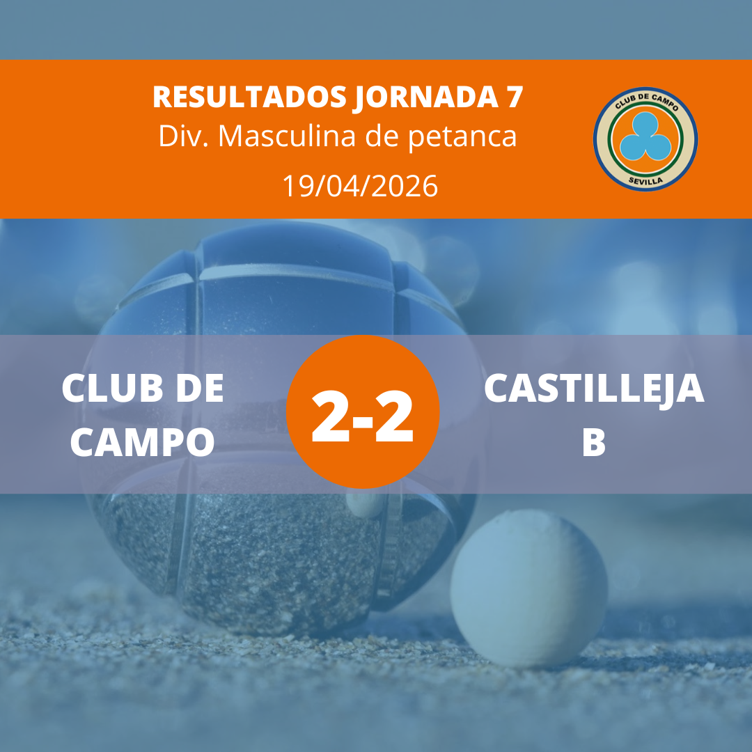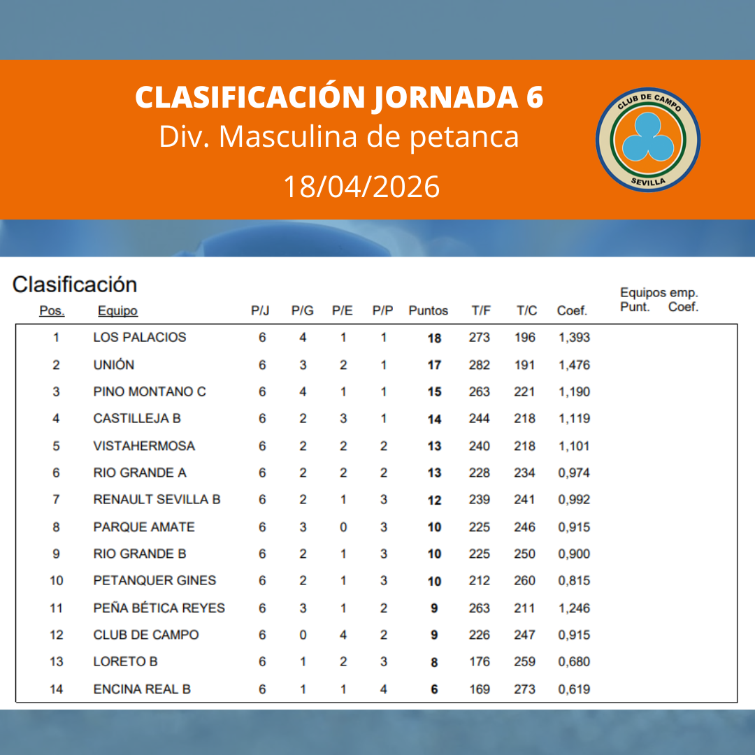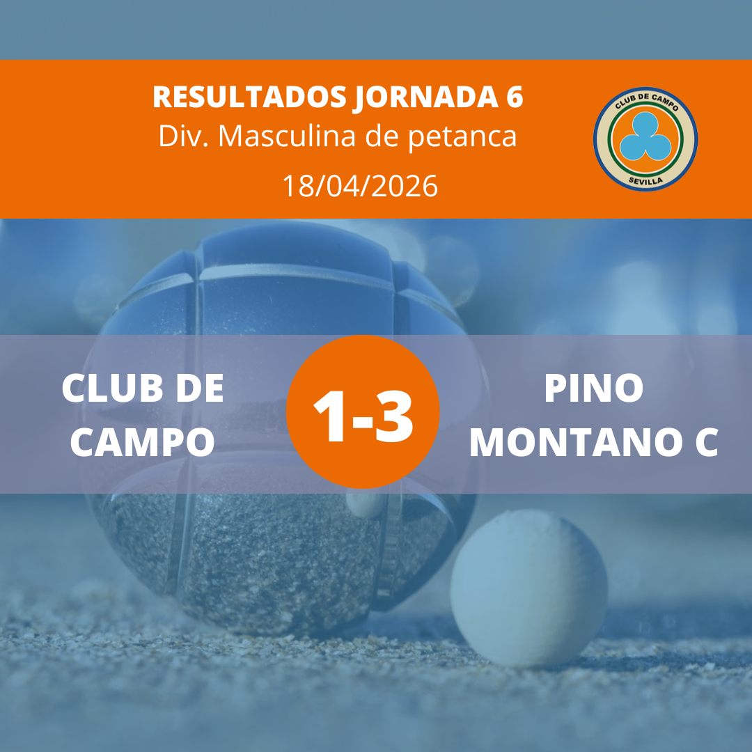 CLUB CAMPO SEVILLA - B 21/04/2026 - 13:01 PMUna vez celebrada la Jornada 6 de petanca de la División Masculina, celebrada el 18 de abril, los resultados son los siguientes: