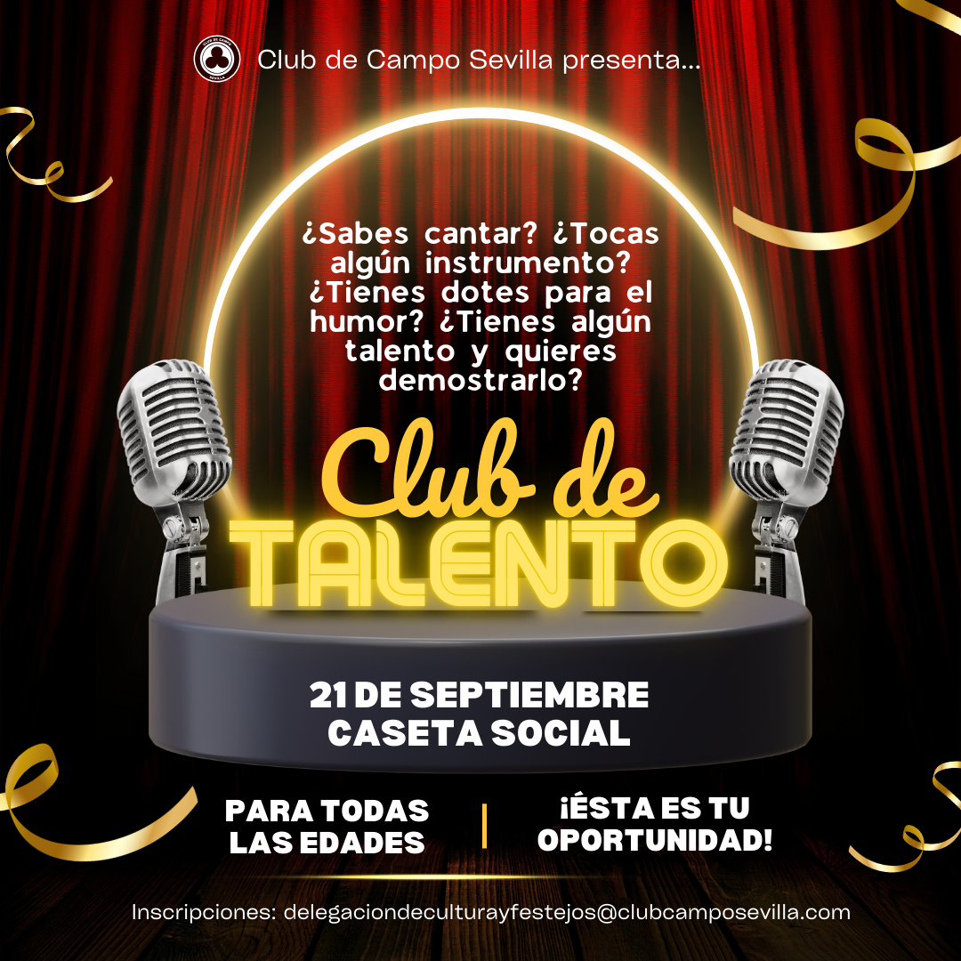 CLUB CAMPO SEVILLA - B 10/07/2024 - 12:36 PMEl próximo 21 de septiembre, la Caseta Social en el Club de Campo Sevilla se convertirá en el escenario perfecto para que brilles y deslumbres a todos con tus habilidades especiales. ¿Tienes la voz de un ángel, mueves los pies al ritmo de la música, dominas algún instrumento, haces imitaciones sorprendentes o tienes la magia en tus manos? ¡Este es tu momento para brillar!