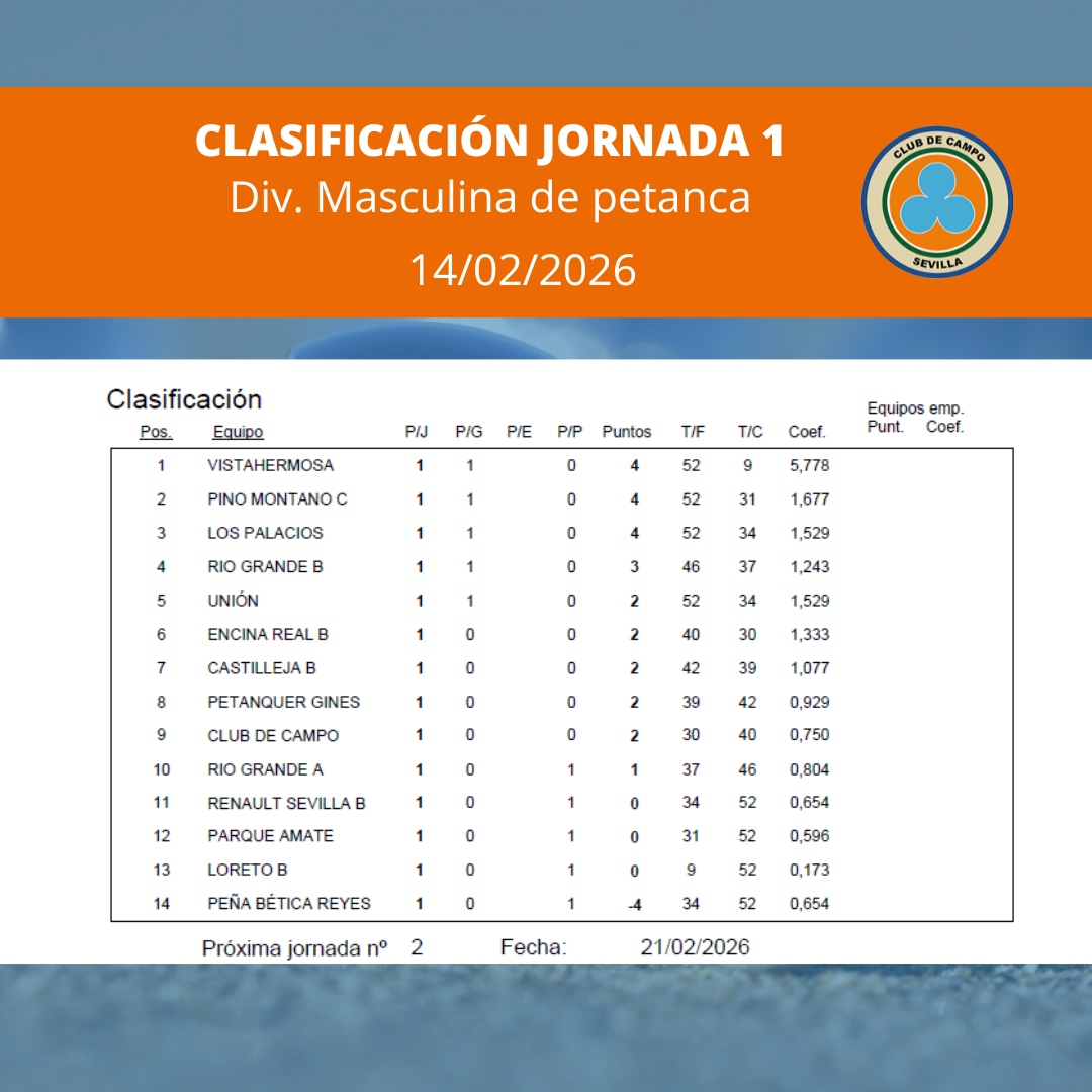 CLUB CAMPO SEVILLA - B 17/02/2026 - 12:46 PMUna vez celebrada la Jornada 1 de petanca de la División Masculina, celebrada el 14 de febrero, los resultados son los siguientes: