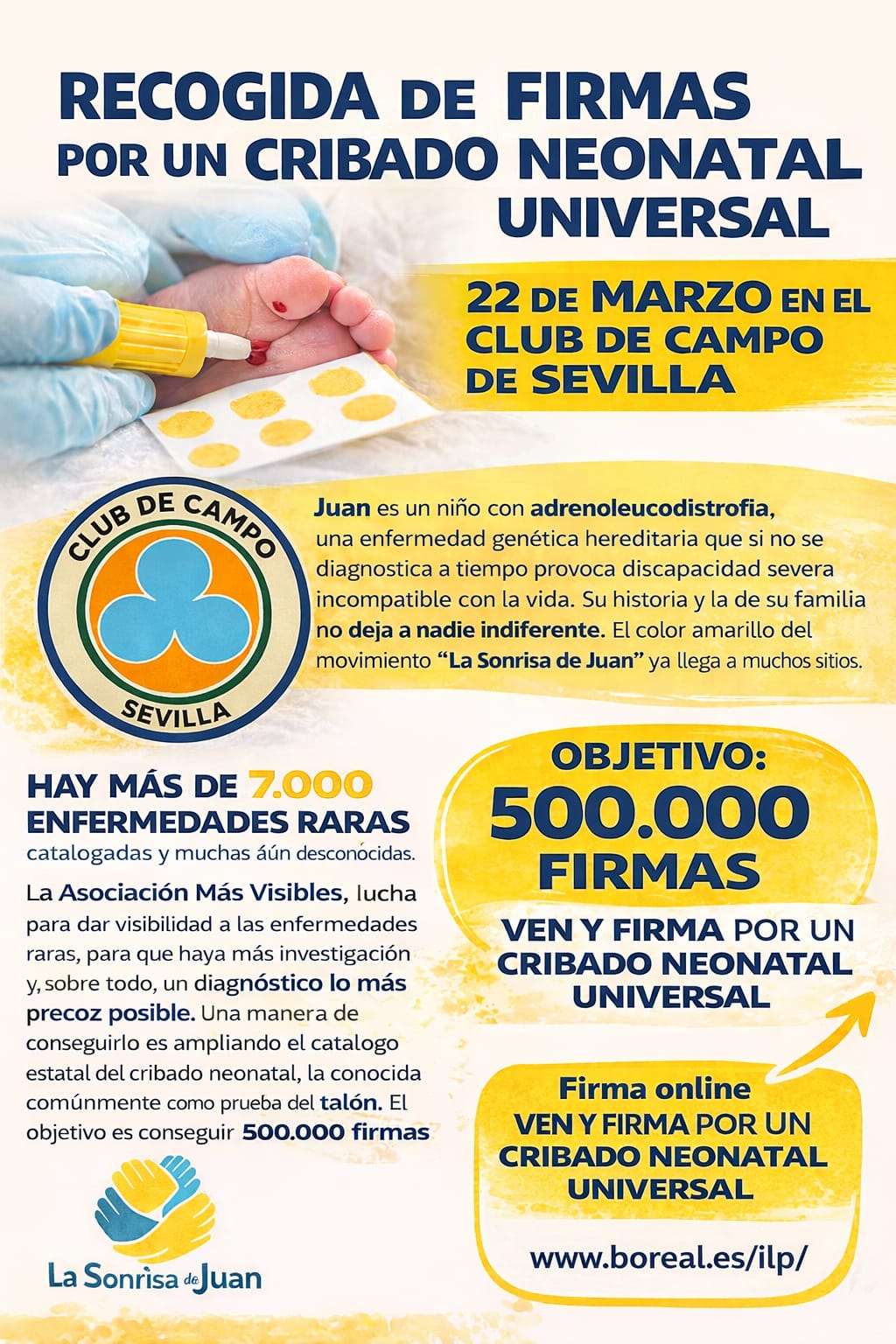 CLUB CAMPO SEVILLA - B 11/03/2026 - 11:52 AMEl próximo 22 de marzo, el Club de Campo Sevilla acogerá una jornada de recogida de firmas para apoyar una iniciativa tan necesaria como urgente: la implantación de un cribado neonatal universal que permita avanzar en la detección precoz de enfermedades raras desde el nacimiento.