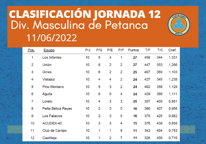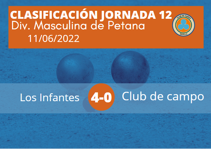 GESTION 21/06/2022 - 13:58 PMUna vez celebrada la Jornada 12 de petanca de la División Masculina 1ª que se celebró el día 04 de junio, los resultados son los siguientes: