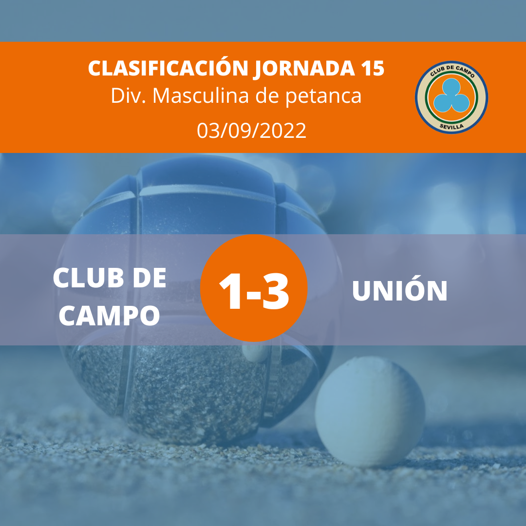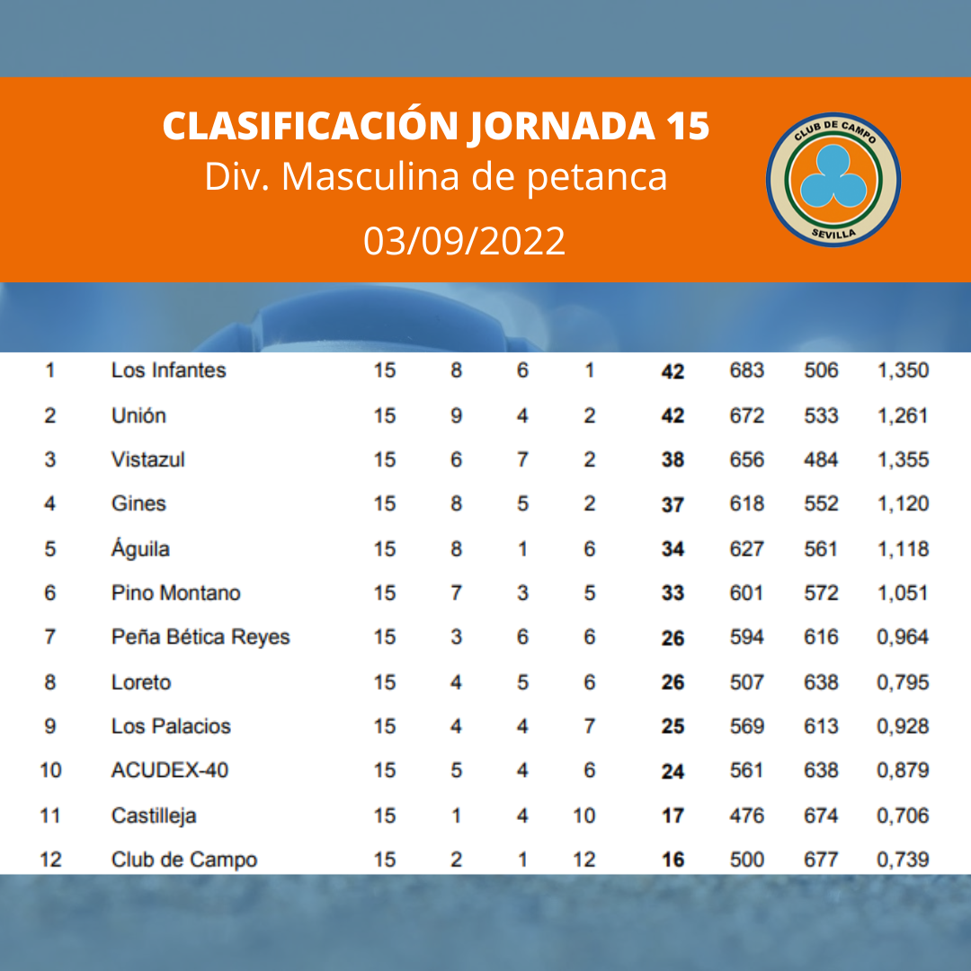 CLUB CAMPO SEVILLA - B 07/09/2022 - 11:45 AMUna vez celebrada la Jornada 15 de petanca de la División Masculina 1ª que se celebró el día 3 de septiembre, los resultados son los siguientes: