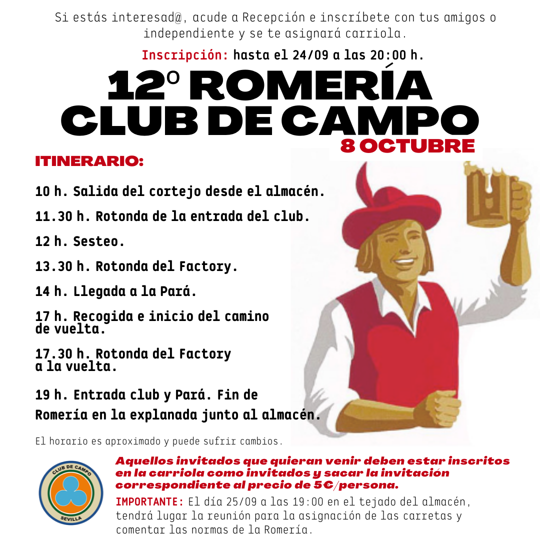 CLUB CAMPO SEVILLA - B 09/09/2022 - 14:00 PMCompartimos el cartel informativo de la celebración de la 12º Romería Club de Campo que tendrá lugar el próximo 8 de octubre.