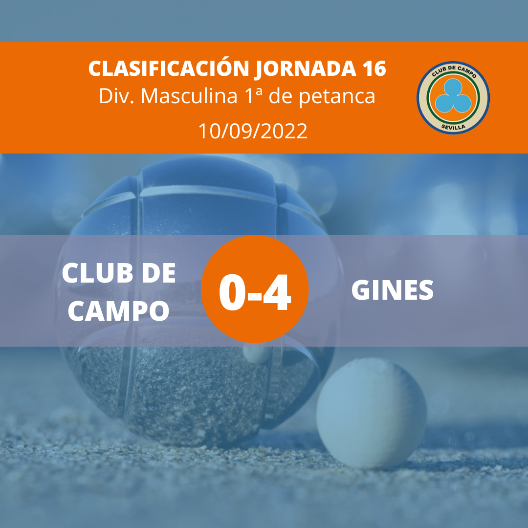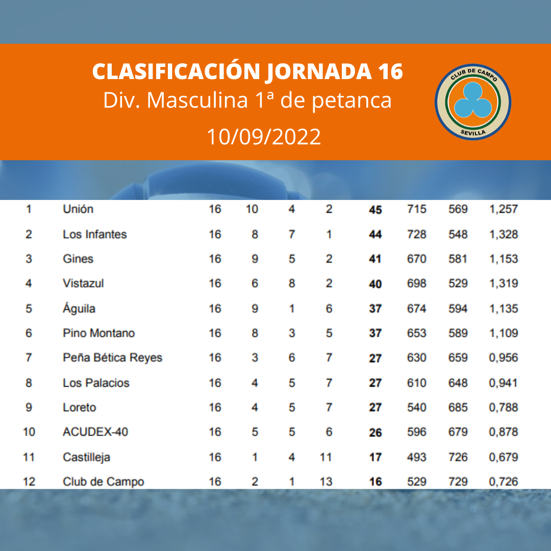 CLUB CAMPO SEVILLA - B 13/09/2022 - 11:20 AMUna vez celebrada la Jornada 16 de petanca de la División Masculina 1ª que se celebró el día 10 de septiembre, los resultados son los siguientes: